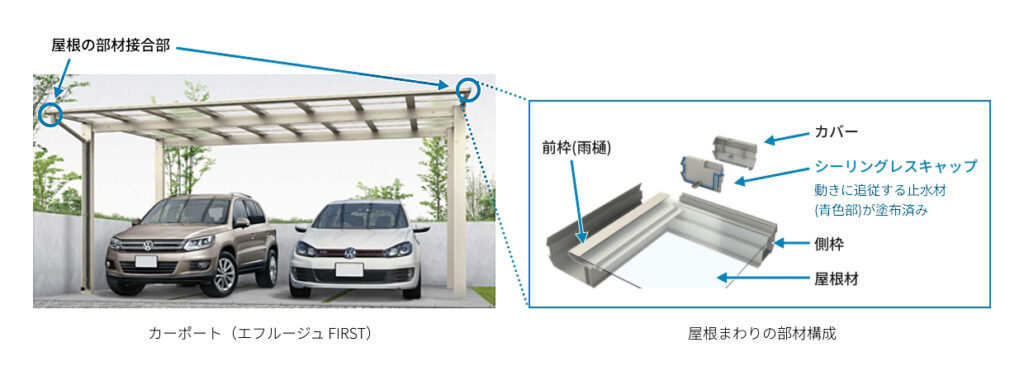 更に、コーキング材って接着剤みたいなものですので、だんだん劣化していきます。そうすると、そこから雨漏りしていくんですね。「担当する職人さんの経験値に左右されず、長持ちするカーポートにしたい」ということで、YKK APのカーポートは「シーリングレス」の技術を採用しています。