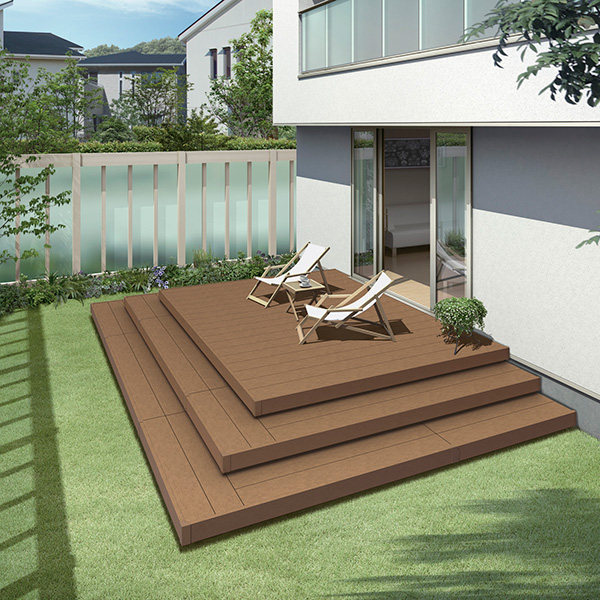 「リウッド」ですので、再生木を使用しています。木粉とプラスチック(ポリプロピレン)を主原料としたノンホルムアルデヒド商品です。木粉が入っていますので完全人工ではなく、木の温かみはしっかり残りつつ、腐食がしにくくお手入れが楽という「いいとこ取り」ですね。