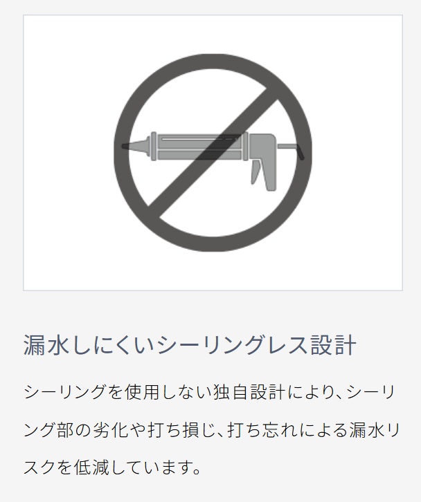 シーリングレスです!カーポートを組み立てていく上で、部品と部品の接合って職人さんがコーキング材を塗布して繋いでいく作業があるんですが、やっぱりあくまで「手作業」ですので、職人さんの腕に左右されてしまう部分が否めなくて。