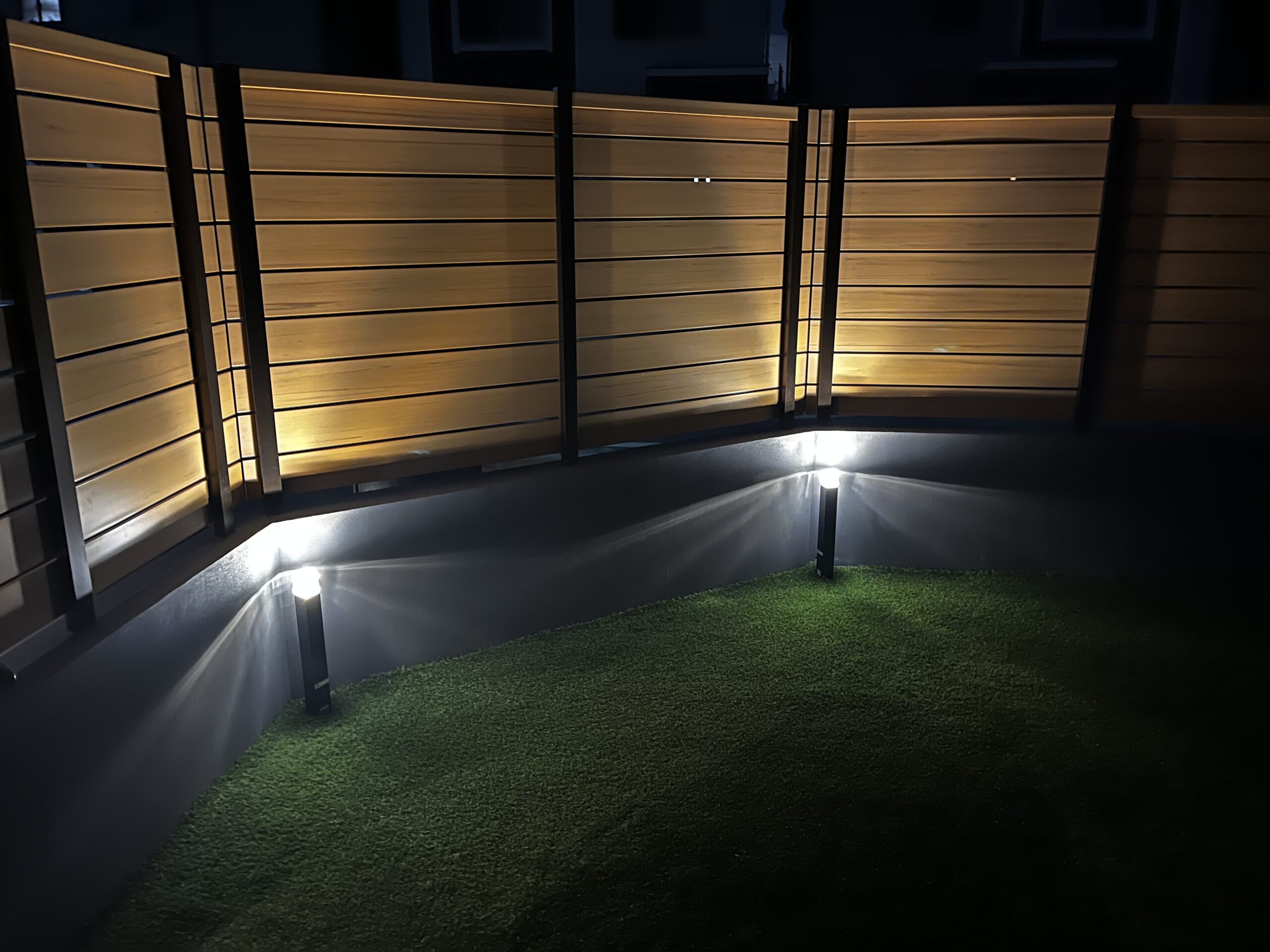 夜のお散歩でもお庭の様子が見えるようにポールライトを埋め込みました。/照明:LIXIL 美彩