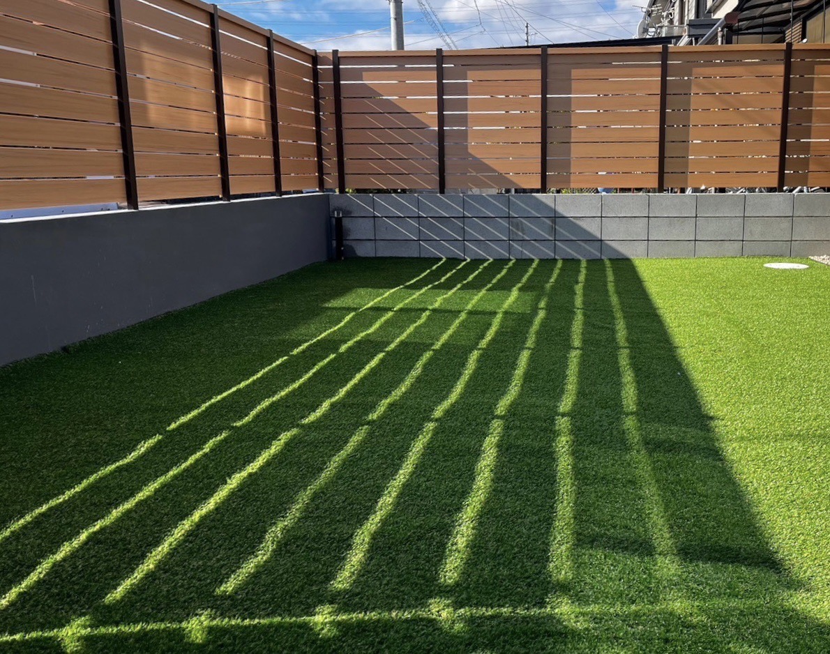 大きなワンちゃんでも走れるくらいの広々したお庭に、肉球を傷めないように人工芝を敷きました。人工芝ならお手入れもほぼ不要で、ふんわり感を長くキープすることができます。