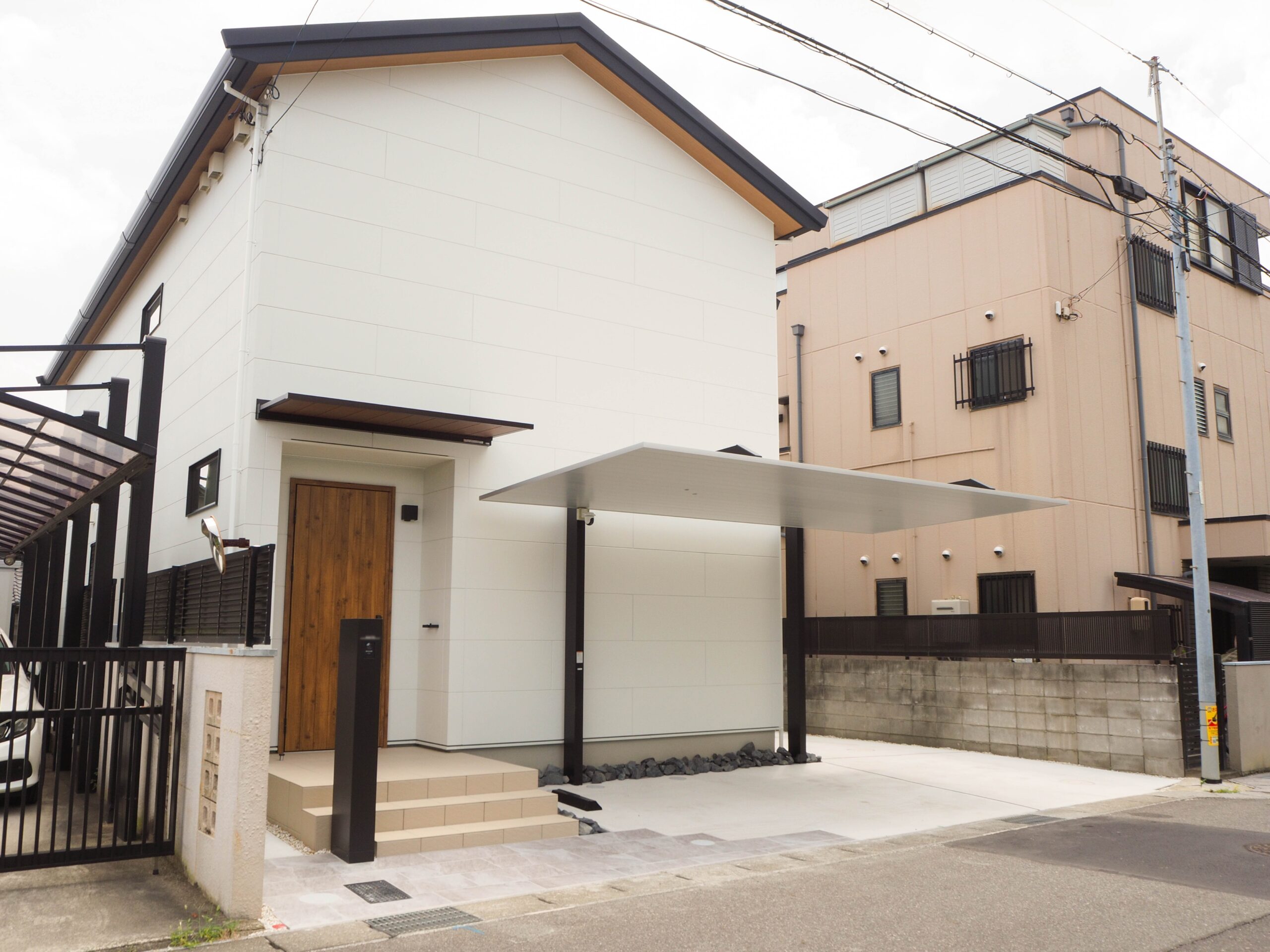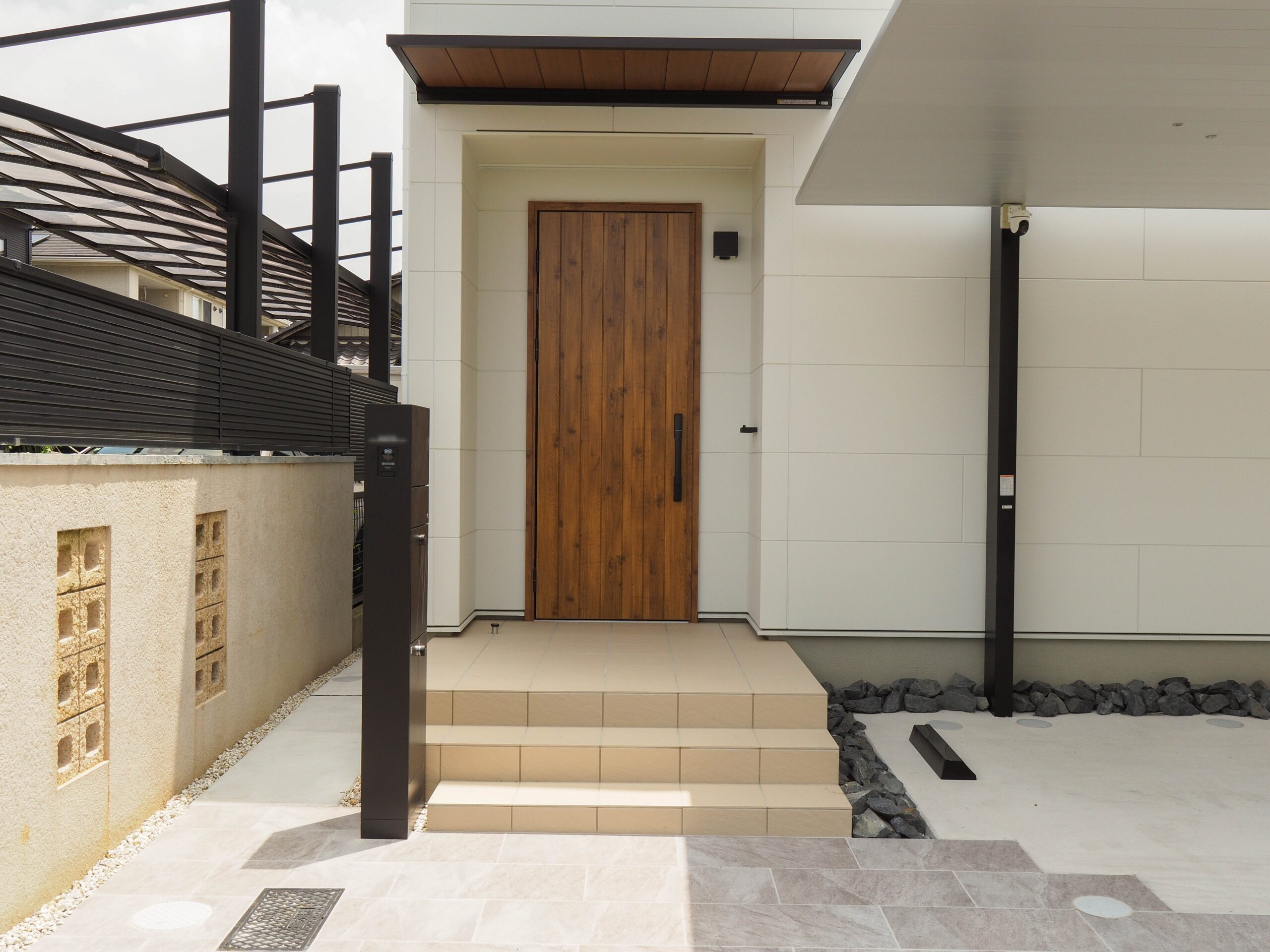 ドア手前左側に見えるのが機能門柱です。SCのスッキリしたデザインに合わせた、LIXILの機能門柱FTをチョイスしました。