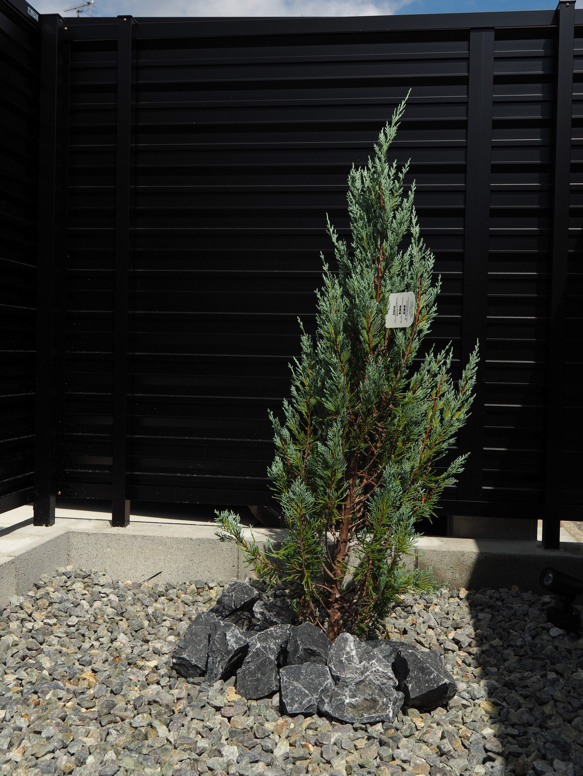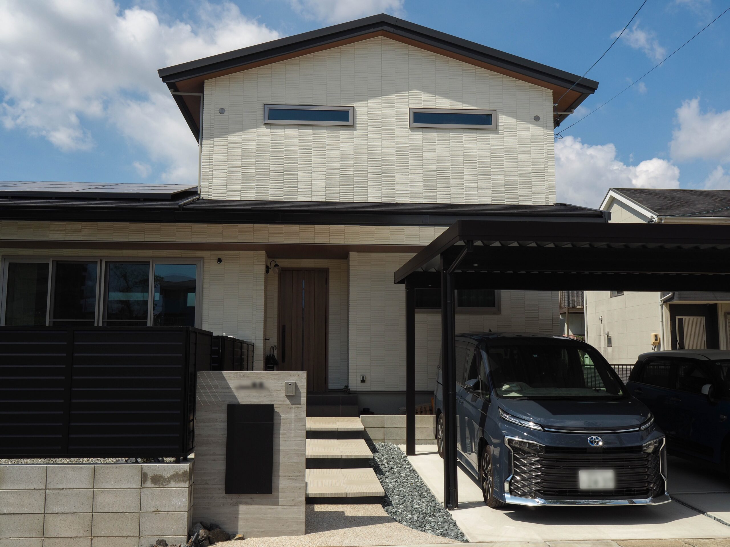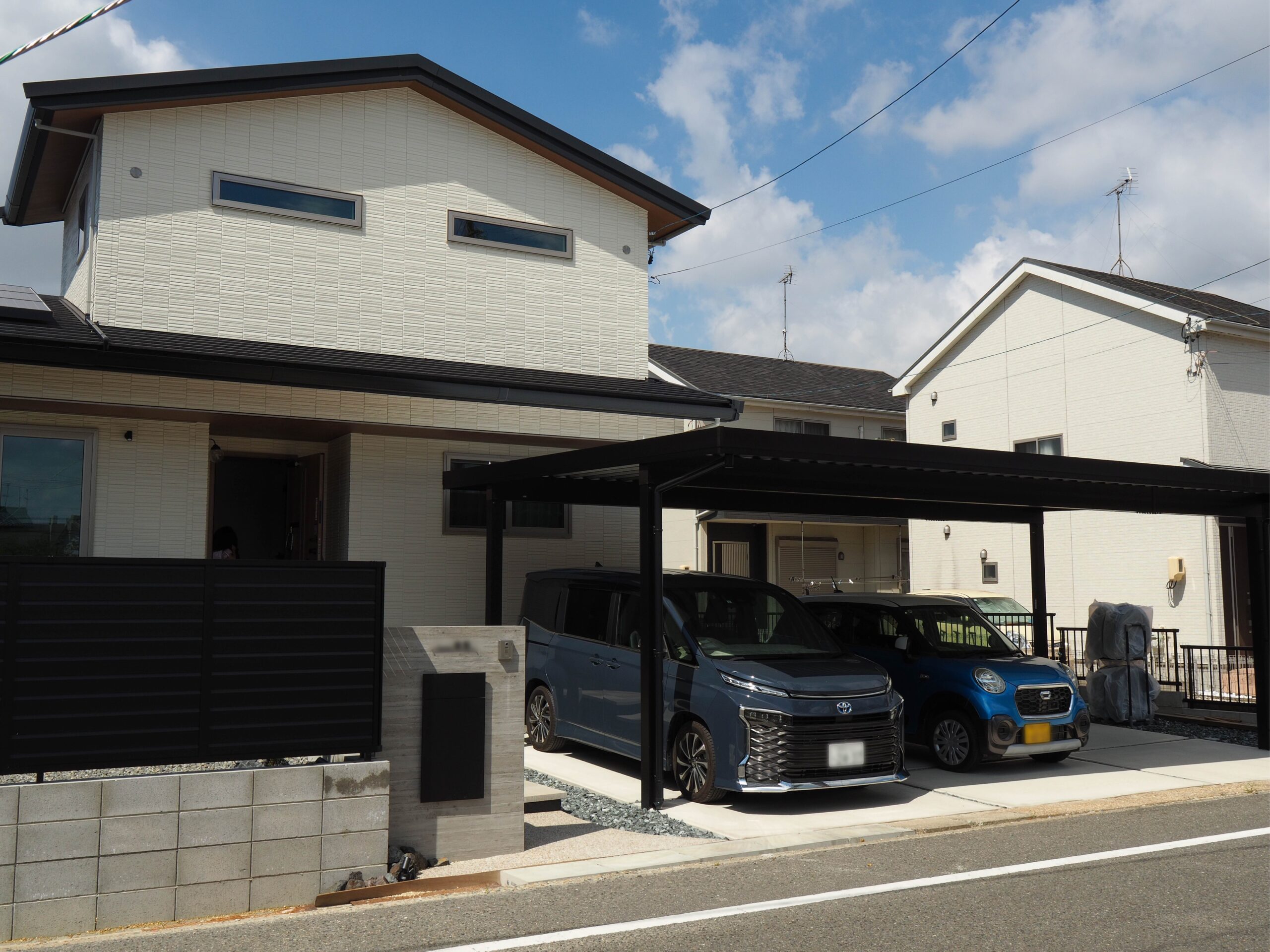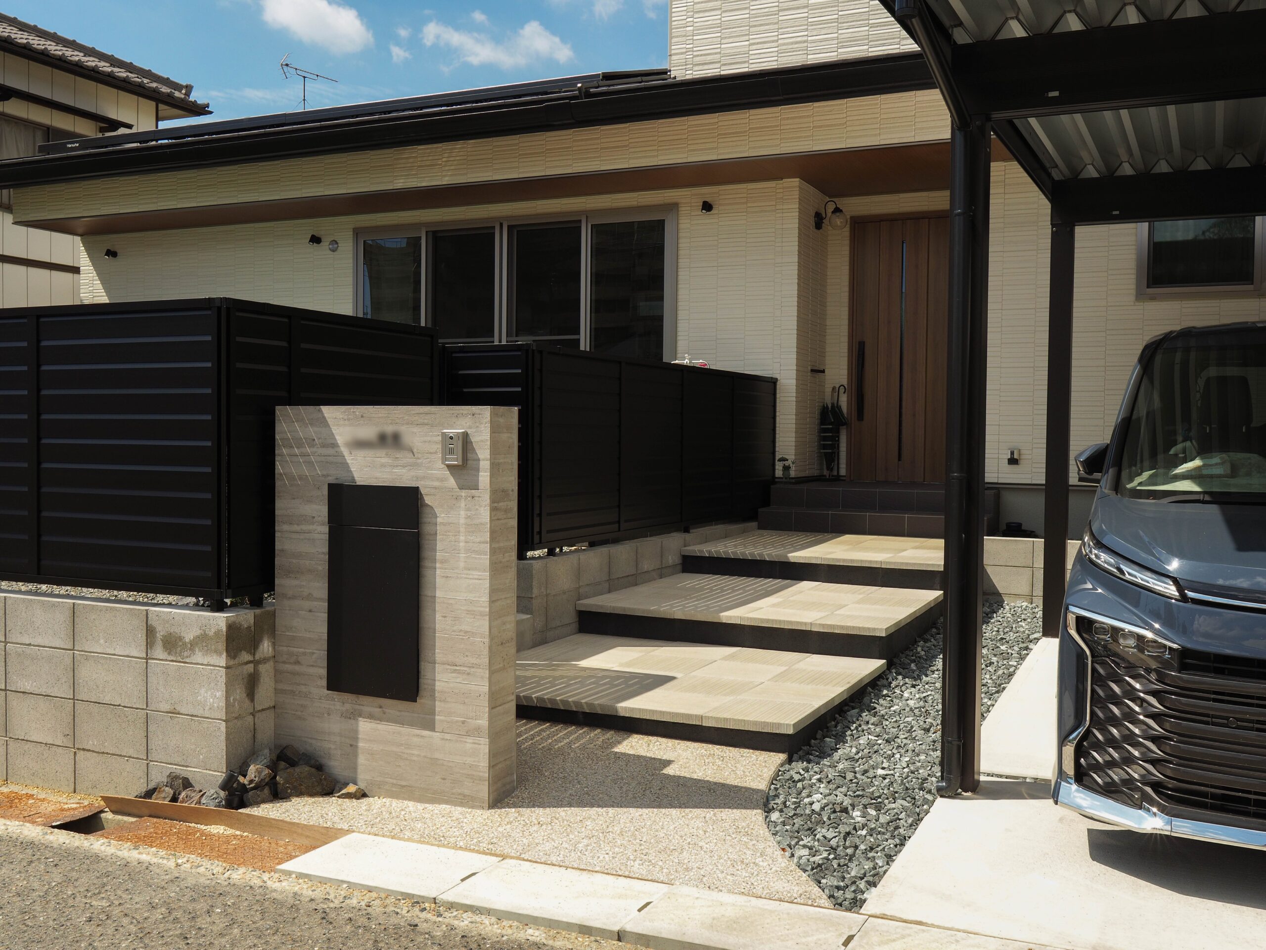 スタイリッシュな黒のセッパンカーポートに合わせ、フェンスや宅配ボックスも黒にして統一感を出しました。ブラックはクールで都会的な雰囲気になりますので、特に男性のお客様からのご要望が多いカラーです。
