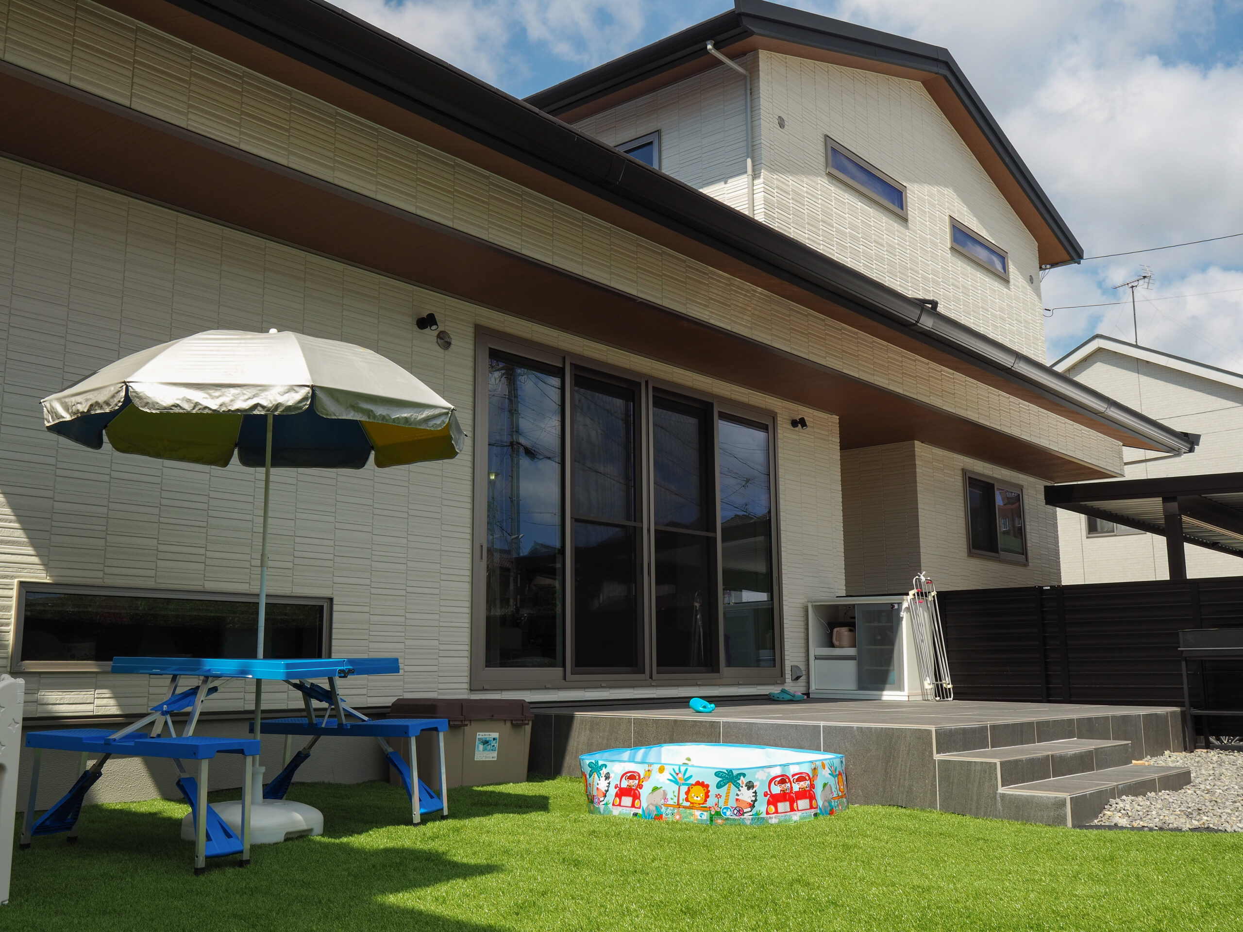 広いお庭でお子さんが遊んだり、バーベキューができるように設計しました。リビングから続くタイルデッキや人工芝は猛暑の太陽下でも熱くなりにくいのでとても安全です。タイルデッキ部分を多くとることで、リビング窓を解放すればセカンドリビングとして使用できるようにしました。お子さんの安全を確保しつつ大人たちもゆっくりとお酒とお食事を楽しめる、最高のおうち時間に。