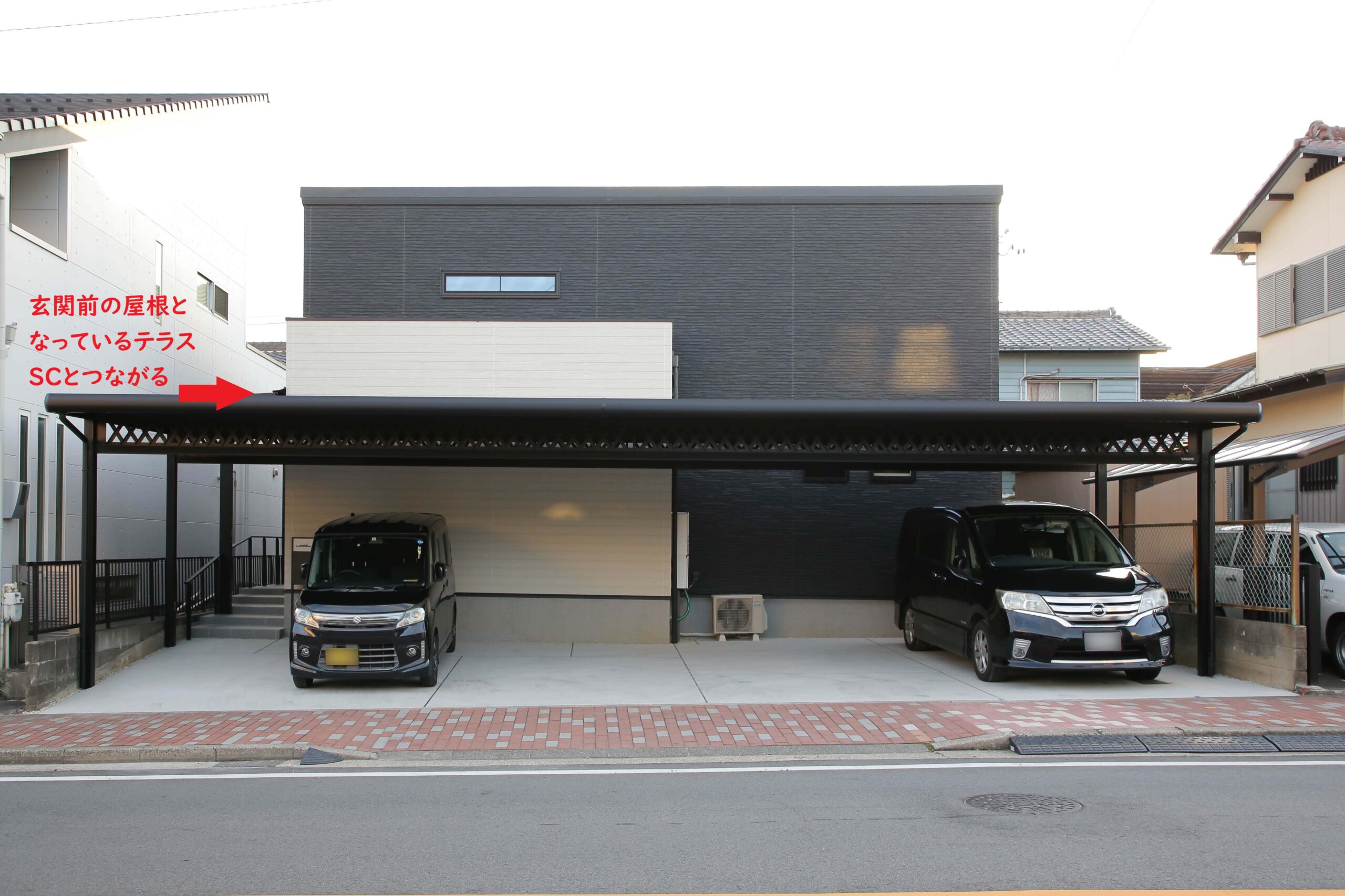 撮影しそこねてしまったのですが(^^;)、左端にある玄関にはLIXILのテラスSC屋根が設置されています。その高さとカーポート屋根の高さがぴったり合うように設置しました。 また、こちらのお土地は前面道路が坂道になっているため、駐車場スペースにも前後左右の勾配がありますが、カーポートが完全水平になるように柱を正確に調整しました。屋根が完全水平でないと落ちてきた雨水が一定方向にのみ流れてしまい、水はけが悪くなる原因となります。