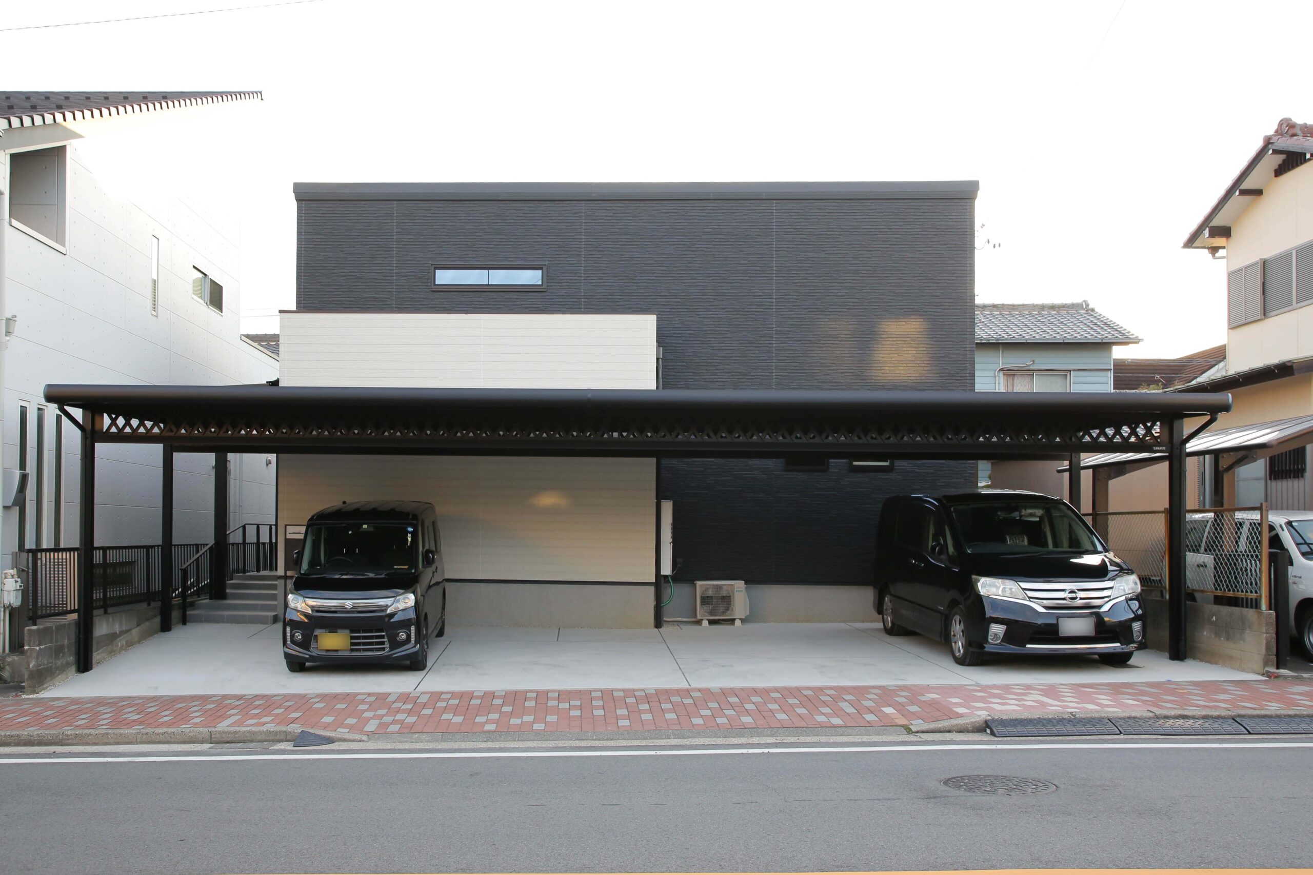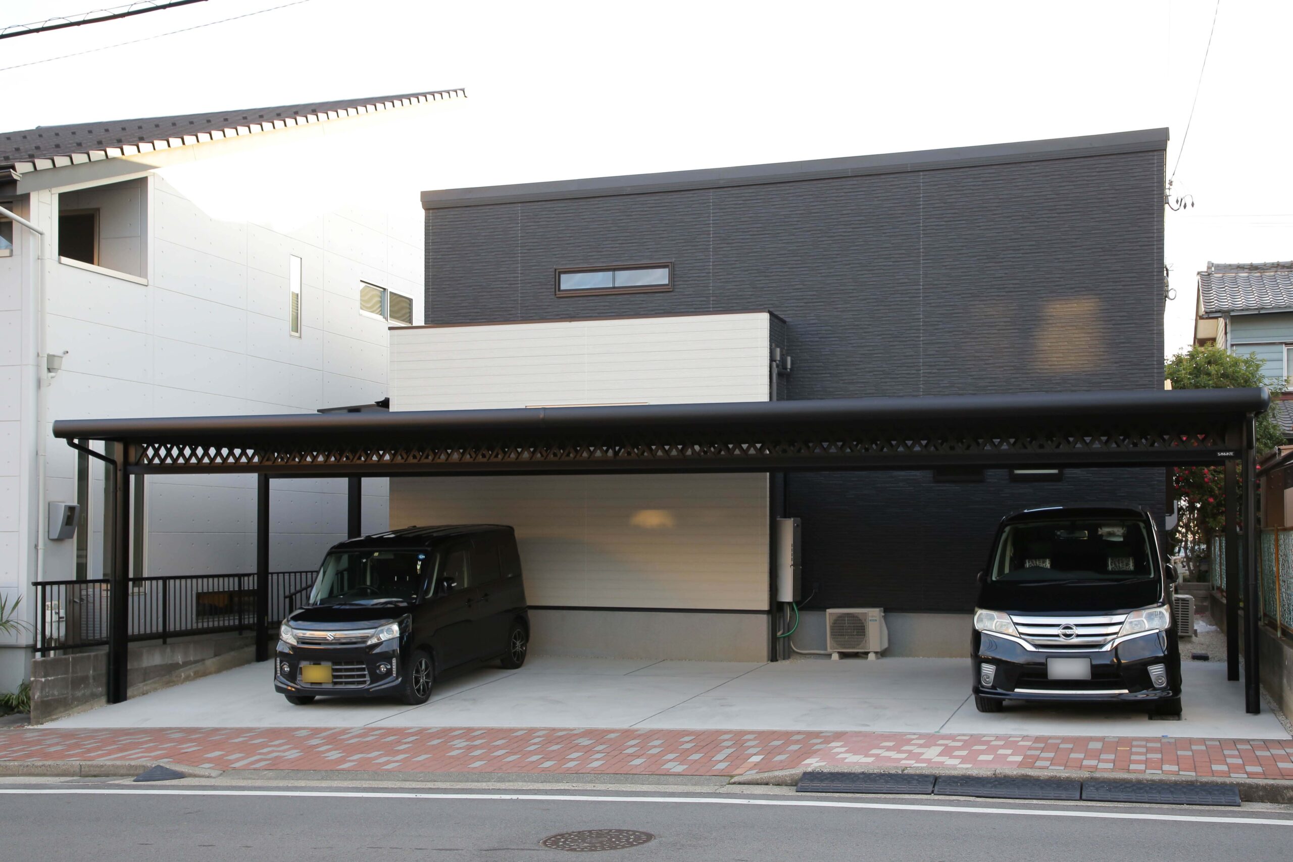 4台分の駐車場をすべて屋根付きにしたい、というご希望をいただき、大きな面積をしっかり頑丈に支えられるセッパンカーポートをおすすめしました。近年のゲリラ豪雨などにもしっかり耐え、長くお使いいただける点がセッパンの強みです。左端は駐車スペースではなく、玄関に続くアプローチとしてご利用いただきますので、雨の日でも車から降りて濡れずにおうちの中に入ることができます。