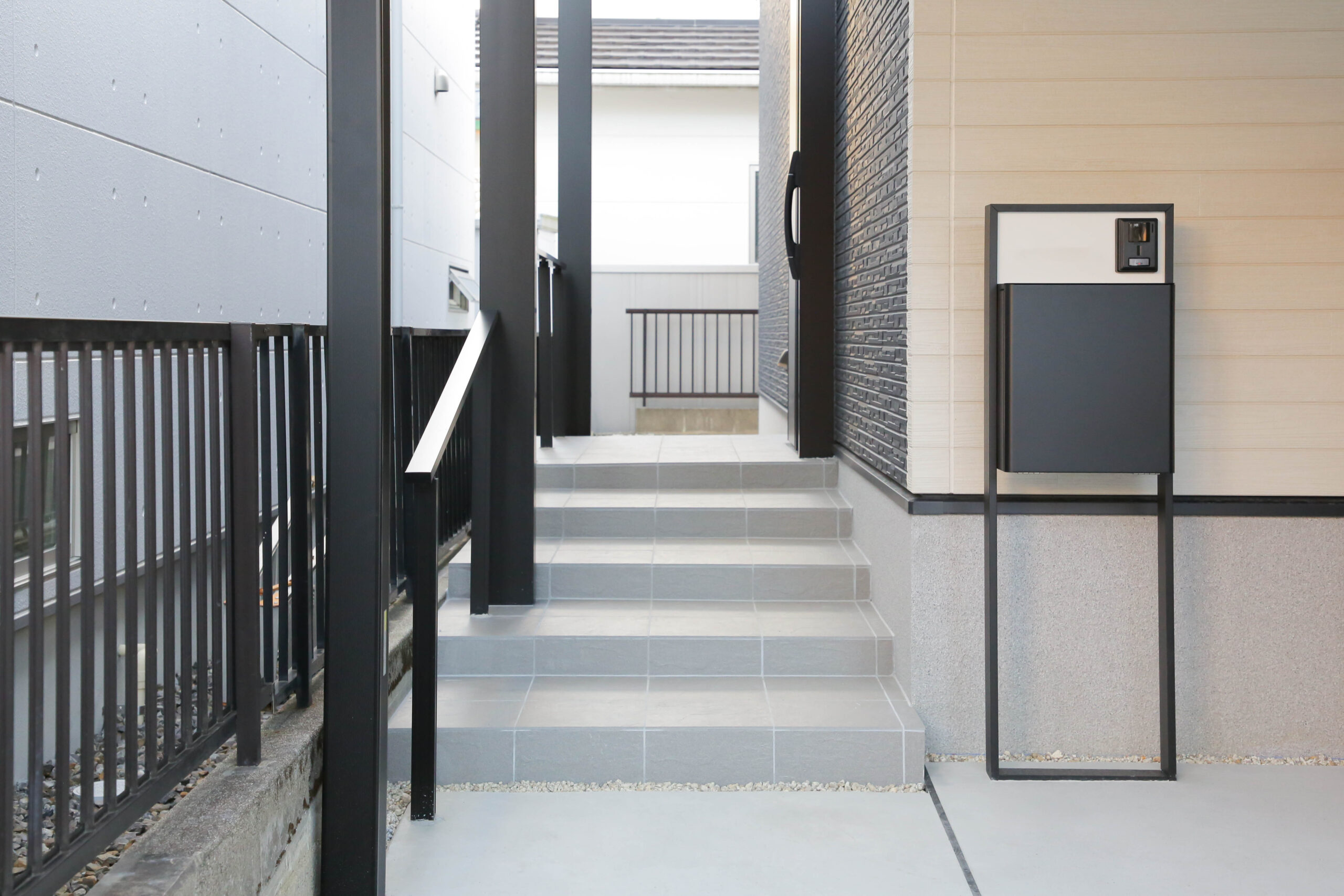 駐車場の左端をアプローチとしてそのまま玄関階段に続くスペースとなります。シンプルな機能門柱を採用することで省スペースに。