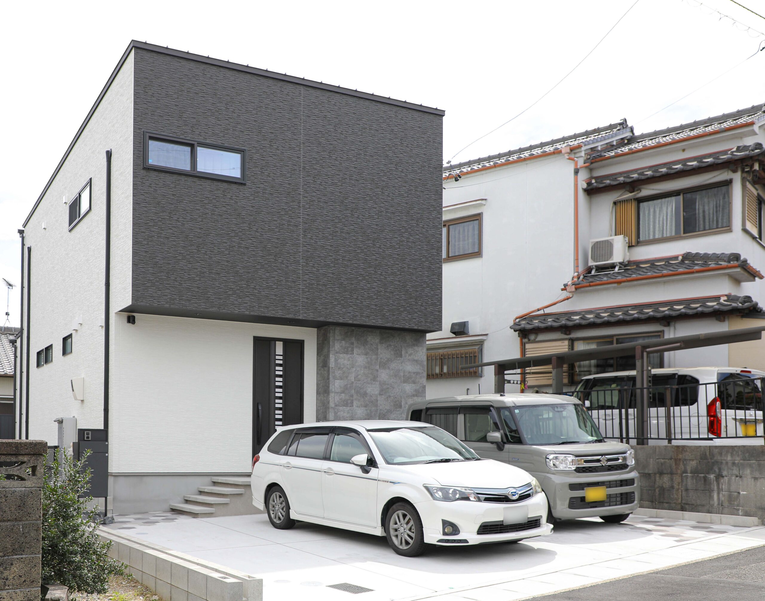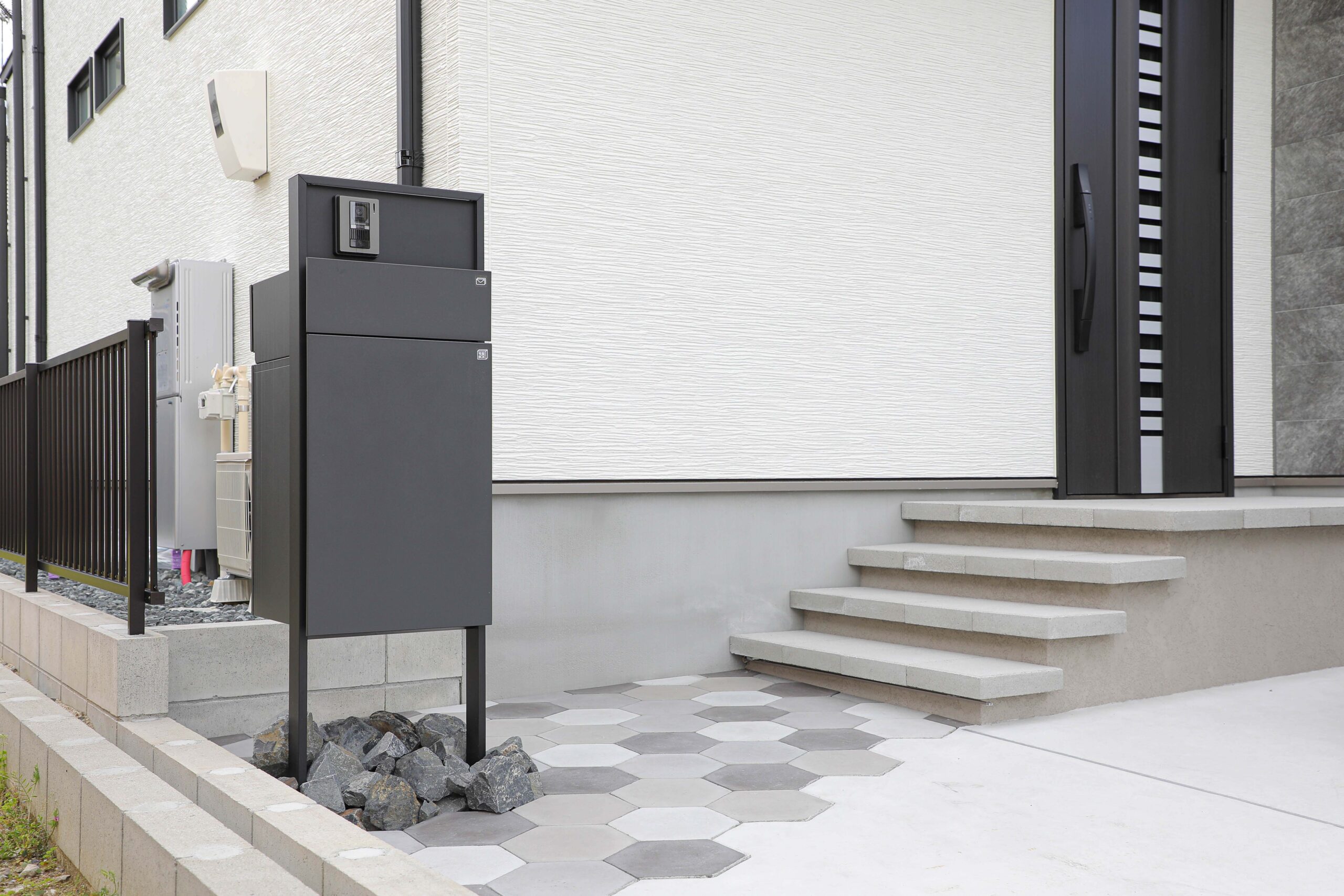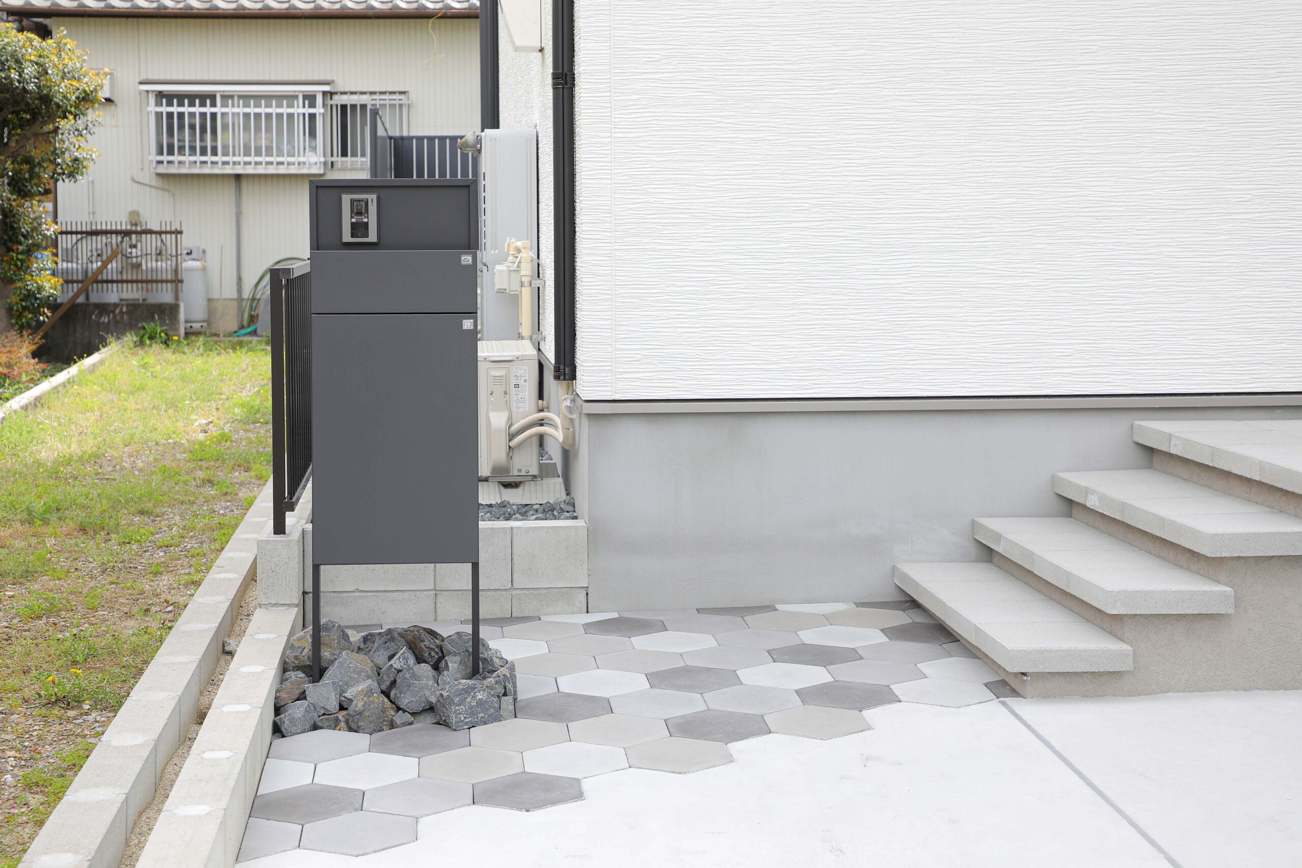 シンプルイズベストではありますが、あまりに飾り気が無いと無機質になってしまいますので、同じモノトーンでも少しだけデザイン性を採り入れることで一気にオシャレ感がアップします。こちらのアプローチには、TOYOというメーカーさんのニュートベイプヘキサという幾何学模様のタイルをミックスで配置しました。駐車スペースとアプローチを区切る境界線にもなりますし、「シンプル」を崩さずに都会的な雰囲気が出ます。