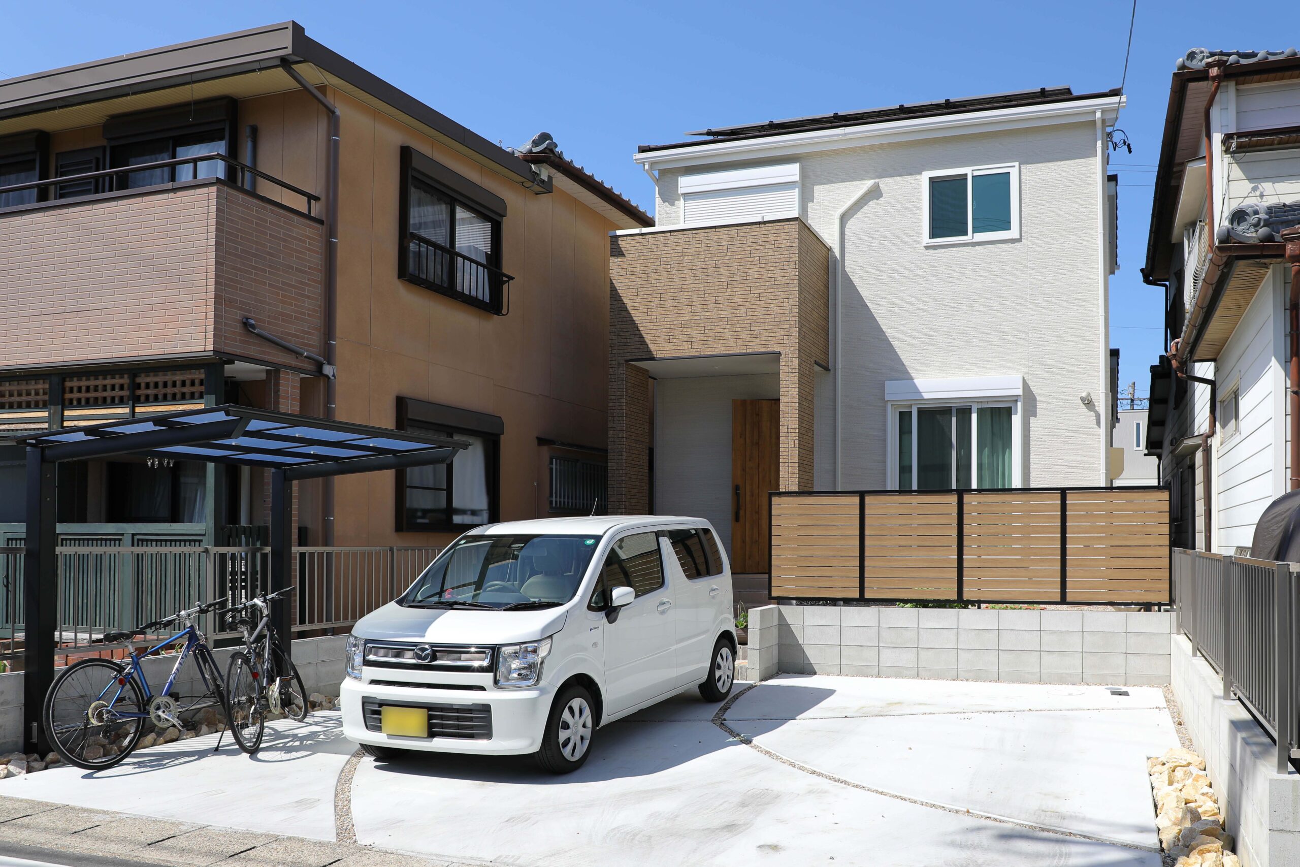 ナチュラルさをより一層引き出すために、駐車場のコンクリートの目地は曲線にしました。コンクリートはどこかに必ず目地を入れないとひび割れの原因となりますので、芝や砂利、コーキング材などで必ず目地を入れます。その目地もデザインのひとつと捉え、オシャレ度を上げるポイントとなります。
